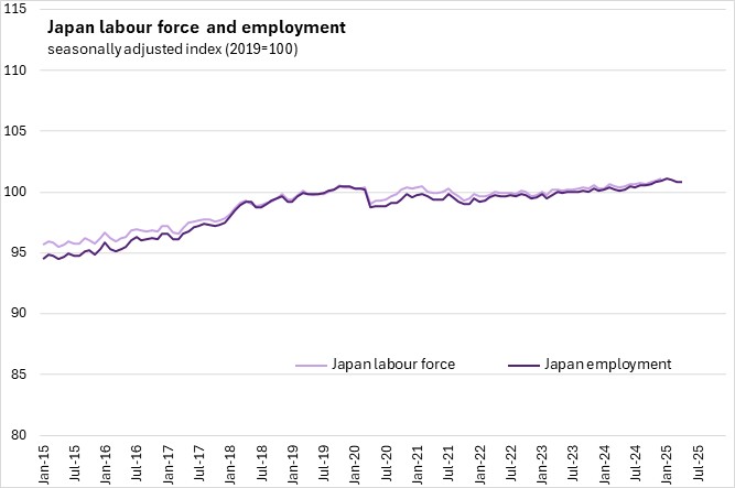 Japan's seasonally adjusted unemployment rate remained unchanged at 2.5% in April 2025. Compared with the previous month, Japan's labour force declined slightly by 0.03% and employment declined by 0.1%.