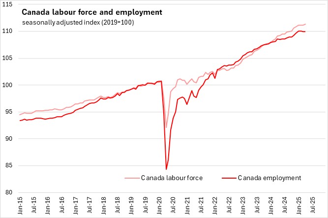 Sources: Statistics Bureau of Japan. Table: 1-a-1 (Seasonally adjusted) Major items (Labour force, Employed person, Employee, Unemployed person, Not in labour force, Unemployment rate (since Jan.1953); Statistics Canada. Table 14-10-0287-01 Labour force characteristics, monthly, seasonally adjusted and trend-cycle