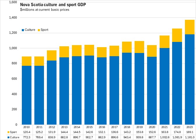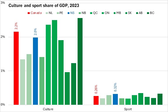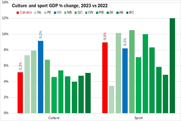 Nova Scotia's GDP from cultural production increased by 9.2% from 2022 to 2023. which was the fastest rise for cultural industries among provinces. Nova Scotia's GDP from sport increased by 8.2%.