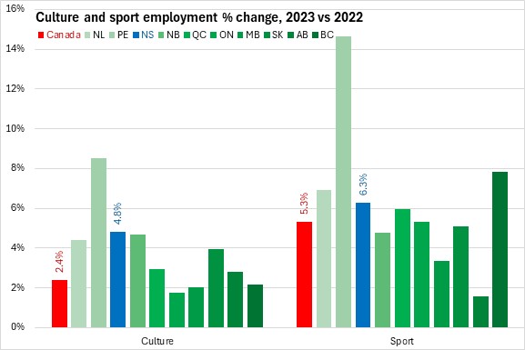 Production of culture and sport products is labour intensive. Nova Scotia's employment in culture products increased by 4.8% in 2023 (+2.4% nationally). Sport employment was up 6.3% in Nova Scotia (+5.3% nationally).