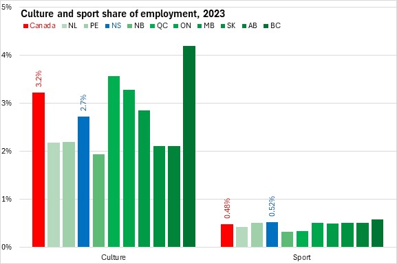 In Nova Scotia, there were 13,973 jobs in cultural production, amounting to 2.7% of provincial employment. Sport production added a further 2,681 jobs; 0.52% of Nova Scotia's employment. Nationally, culture accounted for 3.2% of employment (highest share: British Columbia, lowest share: New Brunswick). Sport accounted for 0.48% of national employment in 2023 (highest shares: British Columbia, lowest share: New Brunswick).