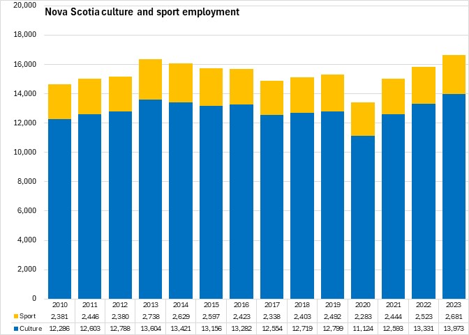 Nova Scotia's culture employment grew to levels above its previous high from 2013 though sport employment in 2023 was slightly below the peak from 2013.