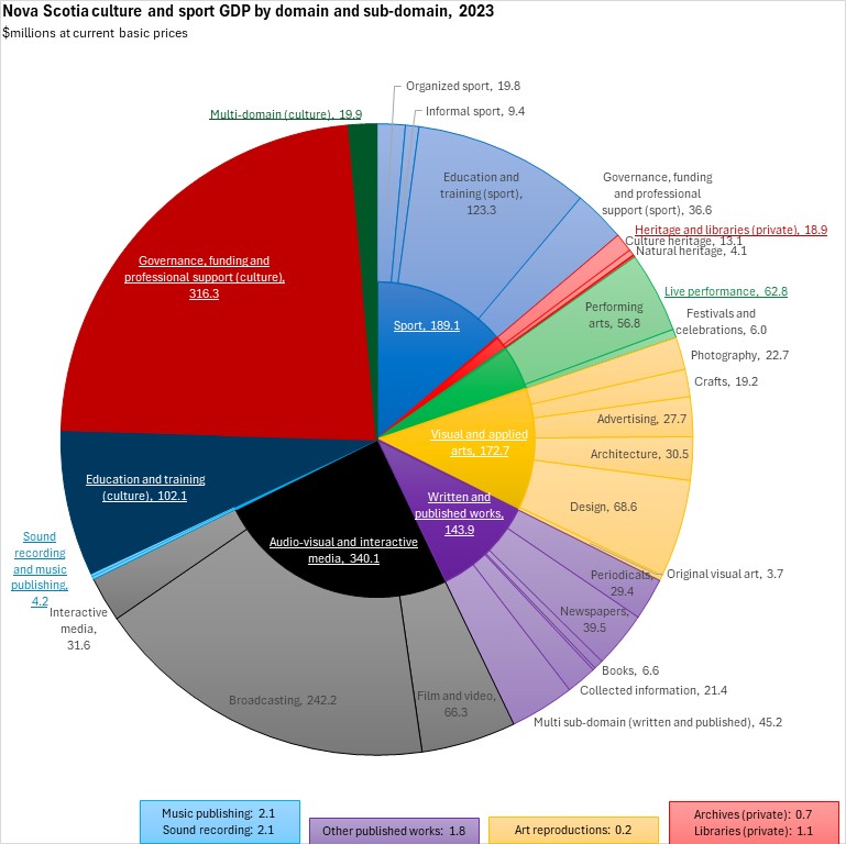 Written and published works were the fifth largest contributor to Nova Scotia's culture and sport GDP, followed by live performance and (private) heritage and library institutions. Sound recording and music publishing was the smallest major domain of culture and sport GDP.