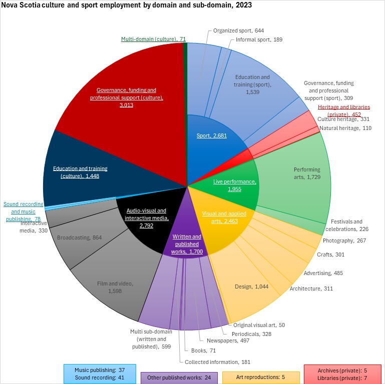 Each domain's contributions to Nova Scotia's culture and sport employment differed somewhat from the contributions to GDP. Governance, funding and professional support in culture remained the largest contributor. Sport was the second largest contributor to employment. Although audio-visual and interactive media was the third largest contributor to employment, jobs in film and video were larger than employment in broadcasting. Notably, employment in performing arts made up a substantially larger share of culture and sport employment than it did of culture and sport GDP.