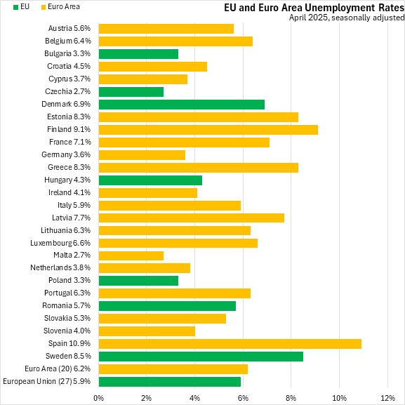 Eurostat has reported that the unemployment rate in the Euro Area was down to 6.2% in April 2025. For the broader 27 countries of the entire European Union, the unemployment rate was unchanged at 5.9% in April 2025.