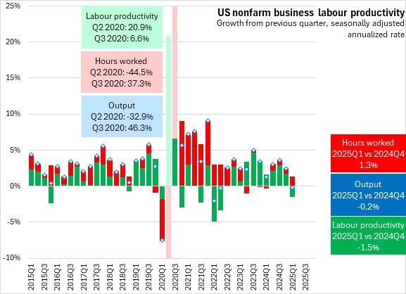 June 05, 2025US PRODUCTIVITY, Q1 2025 [REVISED] The US Bureau of Labor Statistics has released revised productivity estimates for Q1, 2025. All figures are reported as growth from the previous quarter at seasonally adjusted annualized rates.