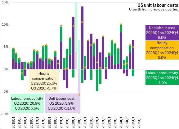 Nonfarm business sector labour productivity in the US fell 1.5%. Output dropped 0.2% and hours worked increased 1.3%. US unit labour costs were up 6.6%, while hourly compensation increased 5.0%.
