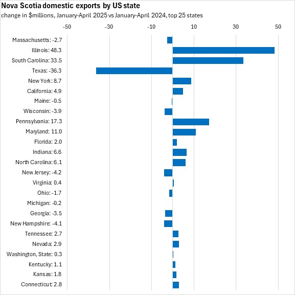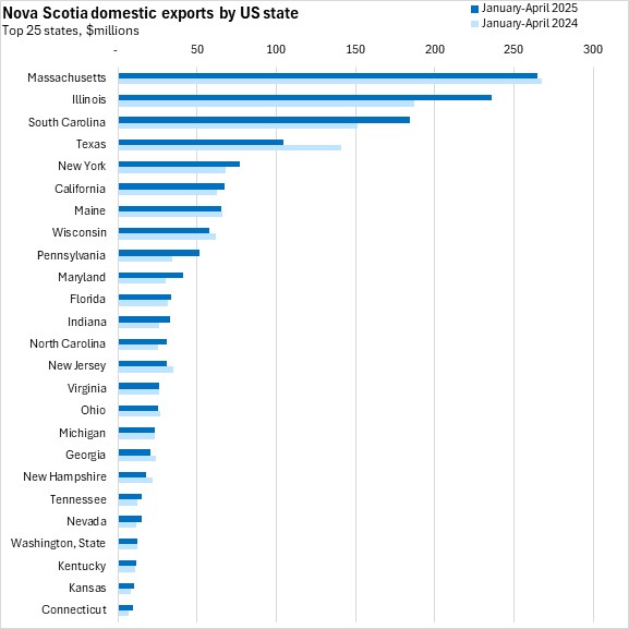 Nova Scotia's exports to the US accounted for 71.4% of exports in January-April 2025. Massachusetts alone had a larger export value to China in the first four months of 2025. Exports were up for six of Nova Scotia's top ten US state destinations; exports were down to Massachusetts, Texas, Maine and Wisconsin. The largest dollar value increase was for Illinois and South Carolina.