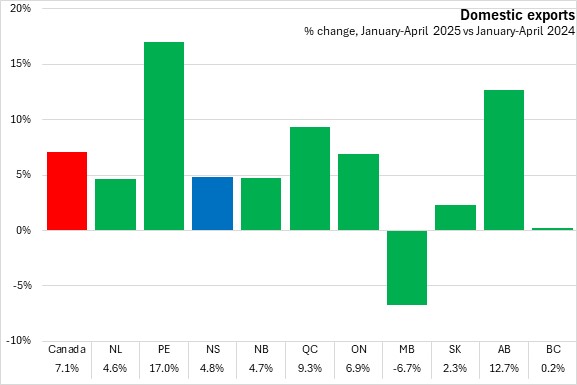 In the first four months of 2025 domestic exports grew 4.8% in Nova Scotia compared to the same period in 2024. Canada's exports increased 7.1% for January-April 2025, with Prince Edward Island reporting the largest gain. Manitoba reported the only decline.