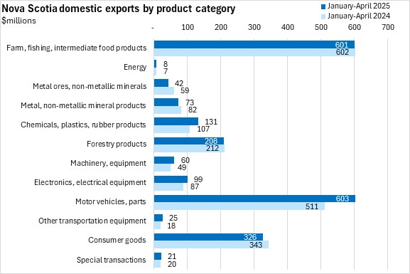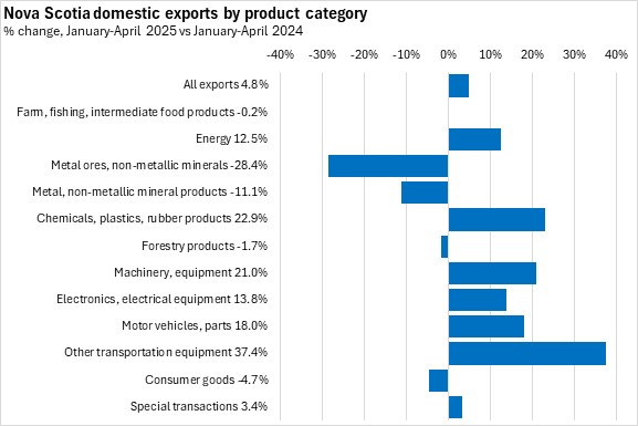 Among broad product categories, Nova Scotia's domestic exports grew the most (in value terms) for motor vehicles/parts, chemicals/plastics/rubber products and electronics/electrical equipment. The largest declines were among shipments of metal ores/non-metallic minerals and metal/non-metallic mineral products, and consumer goods in January-April 2025 compared to January-April 2024.