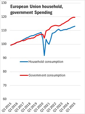 In the second GDP estimate for Q1 2025, the seasonally adjusted annualized growth rate for real GDP was 2.2% for the European Union and 2.5% for the Euro Area (a subset of 20 of the 27 nations of the European Union).