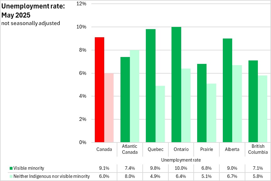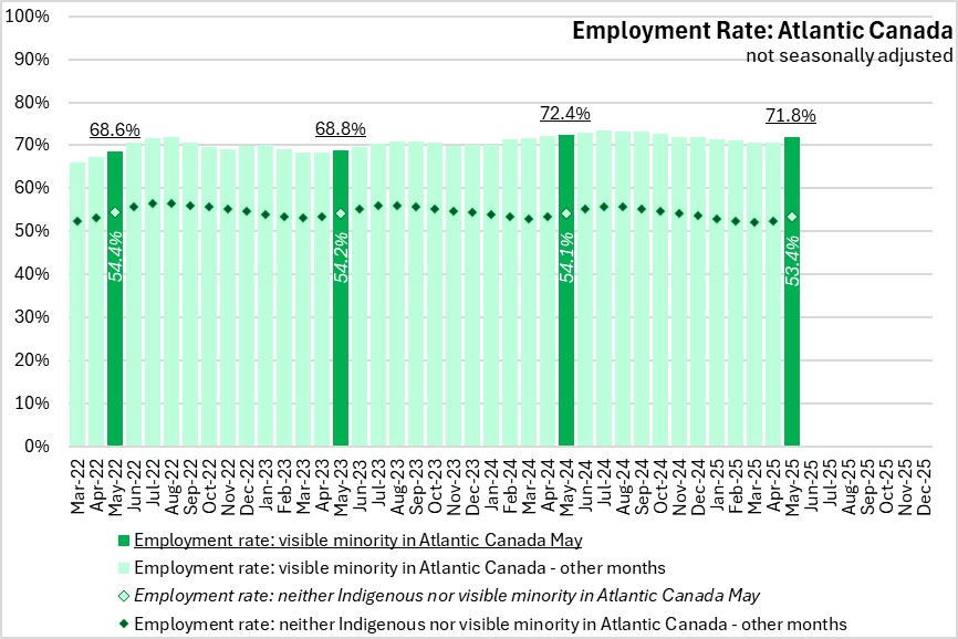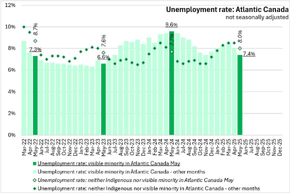 In May 2025, the unemployment rate for the visible minority population was lower than for the population that was neither Indigenous nor in a visible minority population in Atlantic Canada. This was the second month since May 2023 that the unemployment rate of visible minority population was less than the rate for those who identified as neither Indigenous nor in a visible minority population.