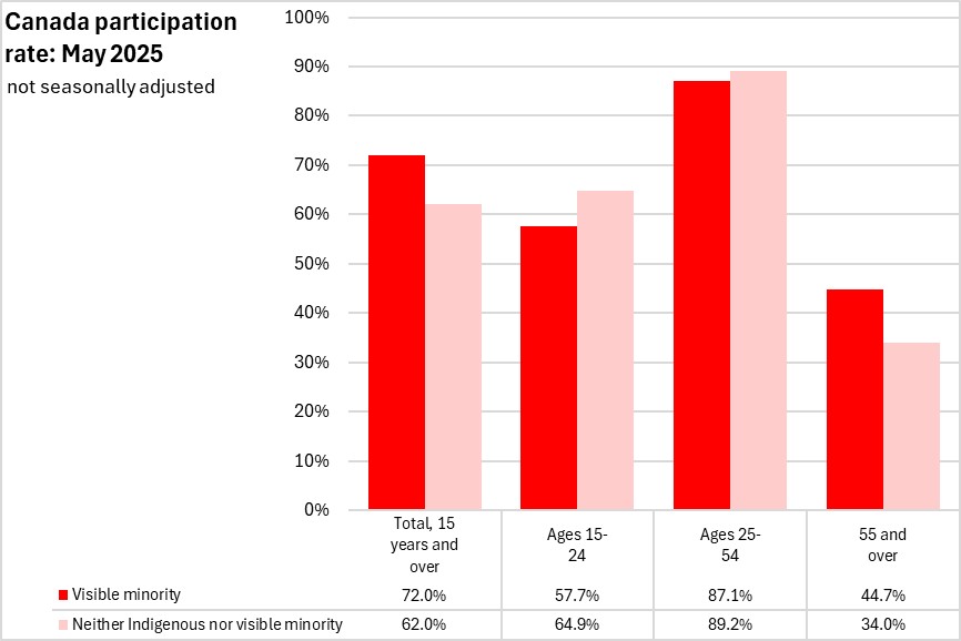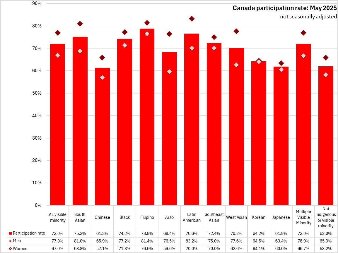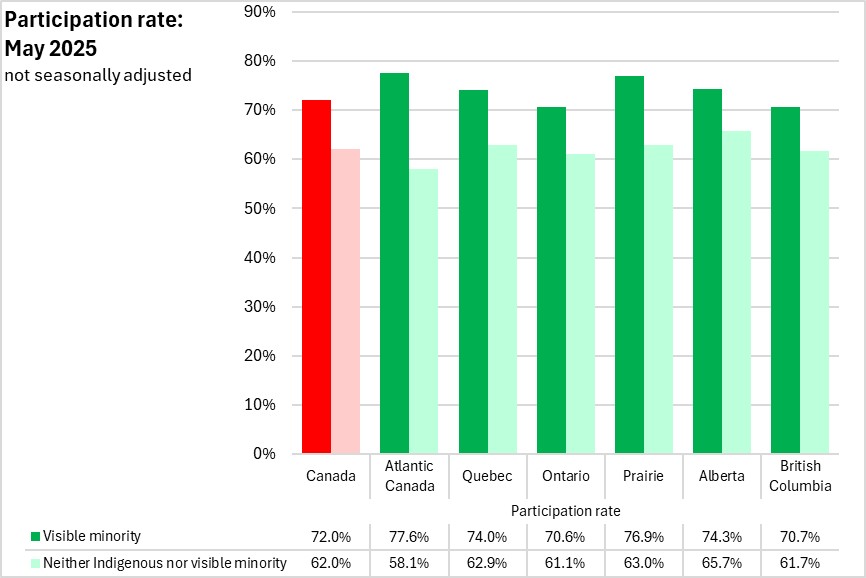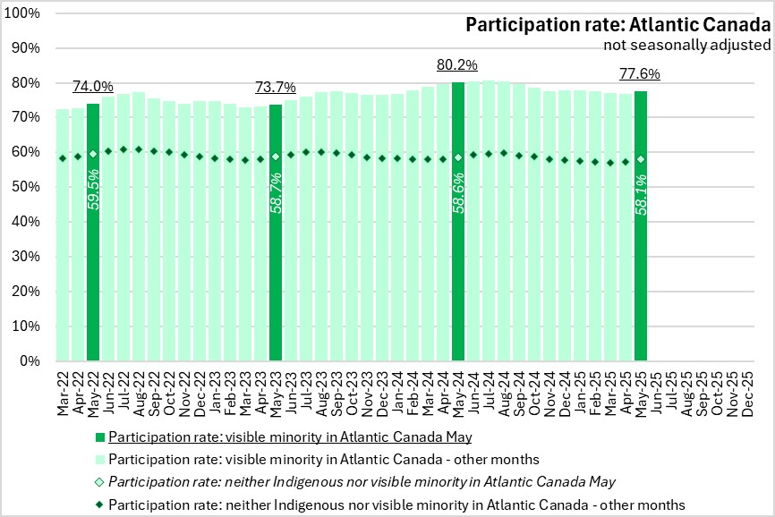 National participation rates were higher for those who identify with a visible minority population (72.0%) than for those that did not identify as Indigenous or in a visible minority population (62.0%). Participation rates of those who identify with a visible minority population were higher in all regions in May 2025. In Atlantic Canada, those who identify with a visible minority population reported a 77.6% participation rate, compared to a 58.1% participation rate for those that do not identify as Indigenous or in a visible minority population, the largest gap among regions.