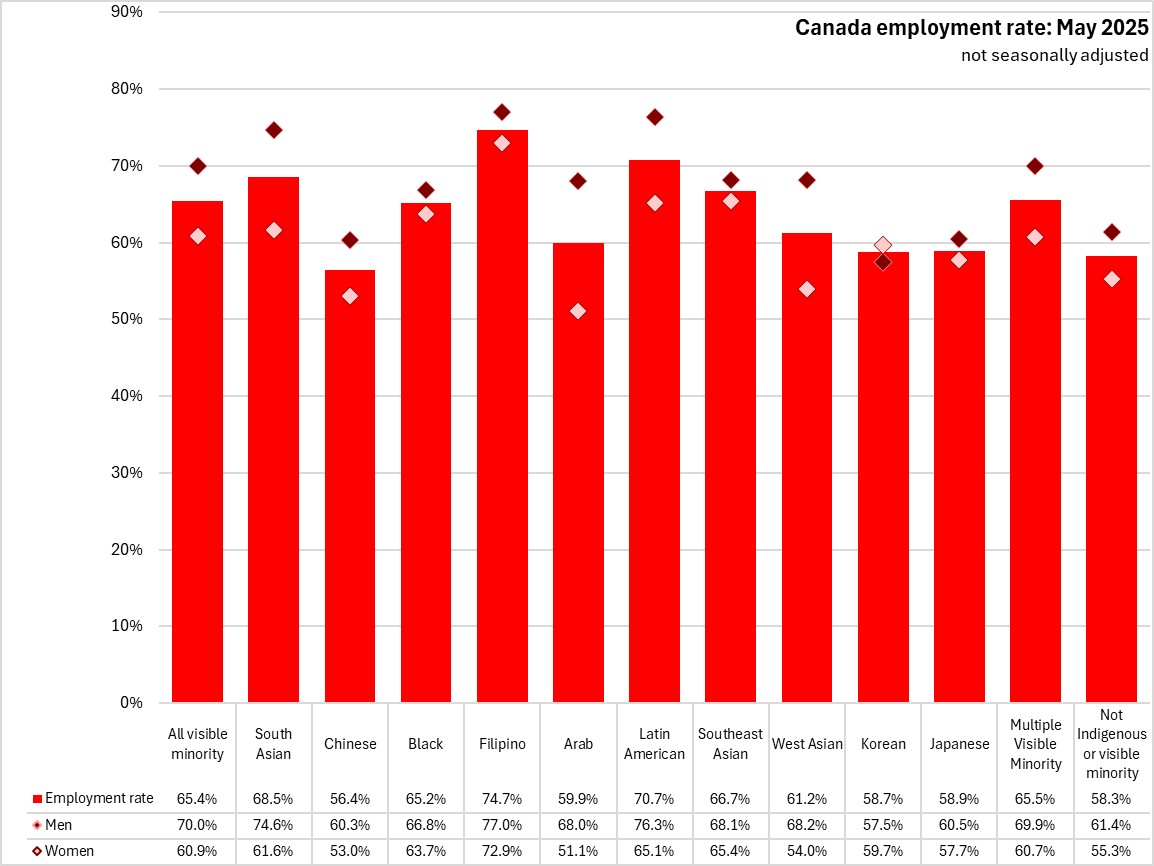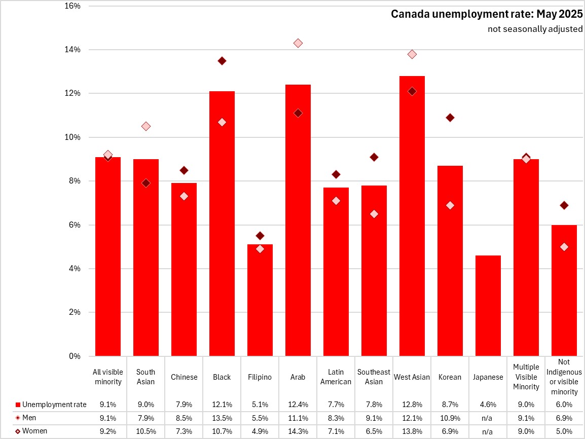 In May 2025, the unemployment rates of males in all visible minority populations were slightly lower (9.1%) than for females in visible minority populations (9.2%), which was not the case for populations that did not identify as Indigenous or visible minorities. Among specific populations, female unemployment rates were lower among Chinese, Black, Filipino, Latin American, Southeast Asian and Korean populations as well as for those that identified with multiple visible minority populations.