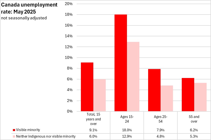 Unemployment rates in Canada were higher for all age cohorts of visible minority populations, when compared with those that do not identify as Indigenous or in a visible minority population. The largest gap was for youth aged workers (aged 15-24).