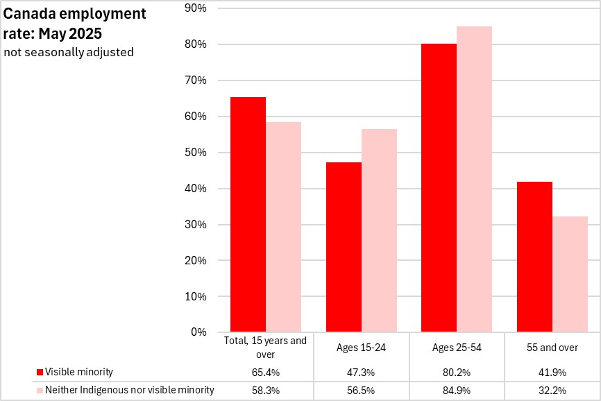 Nationally, employment rates were higher for those who identified with visible minority populations (65.4%) than for those who did not identify as Indigenous or in a visible minority population (58.3%). Employment rates were higher for those who identify with visible minority populations in every region when compared against those who do not identify as Indigenous or in a visible minority population in May 2025. The gap between the employment rates for those who identified with visible minority populations (71.8%) and those who did not (53.4%) was highest in Atlantic Canada.