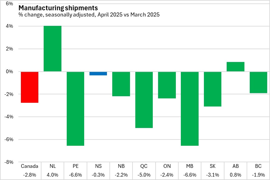 Manufacturing shipments were down in eight provinces. Prince Edward Island and Manitoba reported the largest monthly decrease in manufacturing shipments while Newfoundland and Labrador, and Alberta reported the only increases.