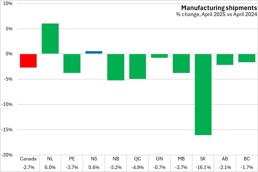 Nova Scotia's manufacturing shipments increased by 0.6% compared to the same month last year in 2024. National shipments decreased 2.7%. Eight provinces reported decreases, led by Saskatchewan. Newfoundland and Labrador and Nova Scotia reported the only year-over-year increases in manufacturing shipments.