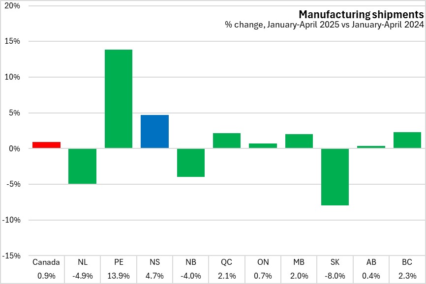 Nova Scotia's manufacturing shipments increased by 4.7% compared to the same period in 2024. National shipments increased 0.9%. Seven provinces reported increases, led by Prince Edward Island. Saskatchewan reported the steepest year-to-date decline.