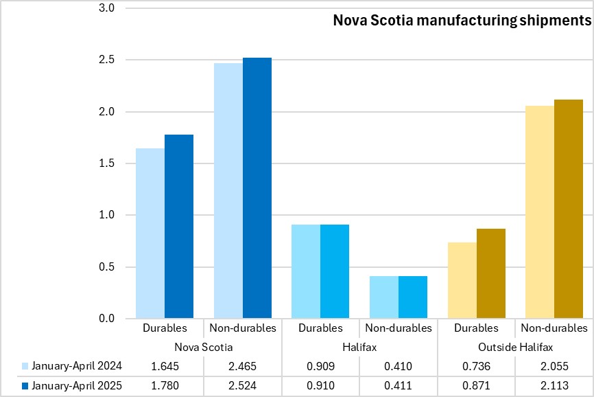 Nova Scotia's year-to-date durable goods shipments increased 8.2%, while non-durable goods shipments increased 2.4% in the same period. In Halifax, durable goods shipments increased 0.02% and non-durables rose 0.2%, year-to-date. Outside Halifax, durables rose 18.3% while non-durables increased 2.8%.