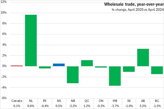 Nova Scotia wholesale trade grew 0.5% in April when compared with the same month last year. Canada's wholesale trade grew 0.1%, year-over-year. Six provinces reported lower year-over-year wholesale trade with Manitoba reporting the steepest decline. Newfoundland and Labrador reported the fastest year-over-year rise in wholesale trade.