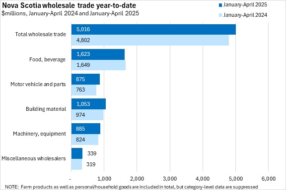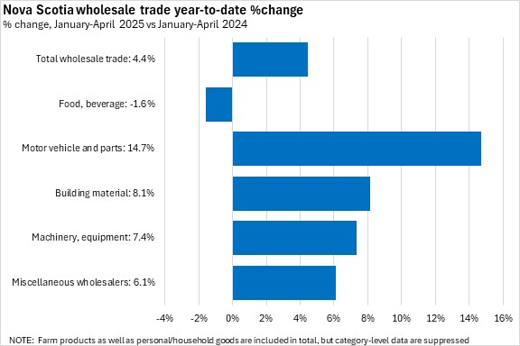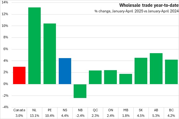 Nova Scotia wholesale trade increased 4.4% in the first four months of 2025 compared to the same period of 2024. Canada's wholesale trade increased 3.0%. All provinces except New Brunswick reported year-to-date increases in wholesale trade. Newfoundland and Labrador reported the fastest gain.