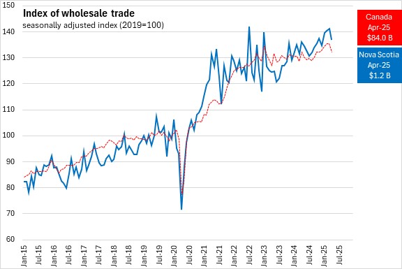 National wholesale trade (excluding petroleum products and oilseed and grains) was relatively stable from 2023 to mid-2024 and had been trending upward until a sharp decline in April 2025. Nova Scotia wholesale trade follows a similar upward trend as national wholesale trade, with more volatility from month to month.