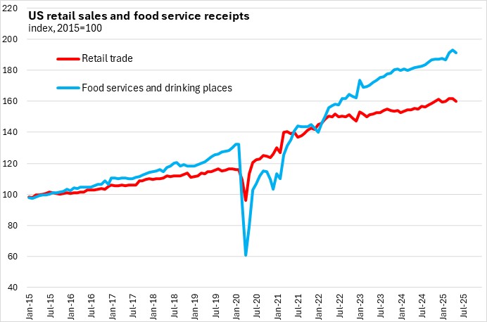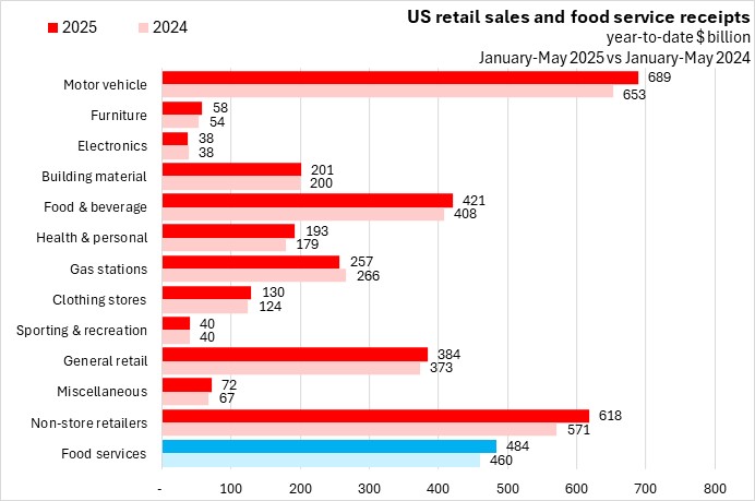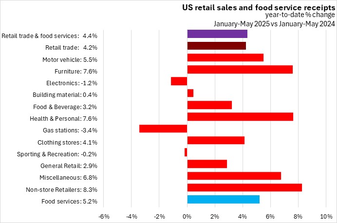 US retail trade and food services receipts increased 3.3% from May 2024 to May 2025. Retail trade increased 3.0% and food services and drinking places sales increased 5.3%.
