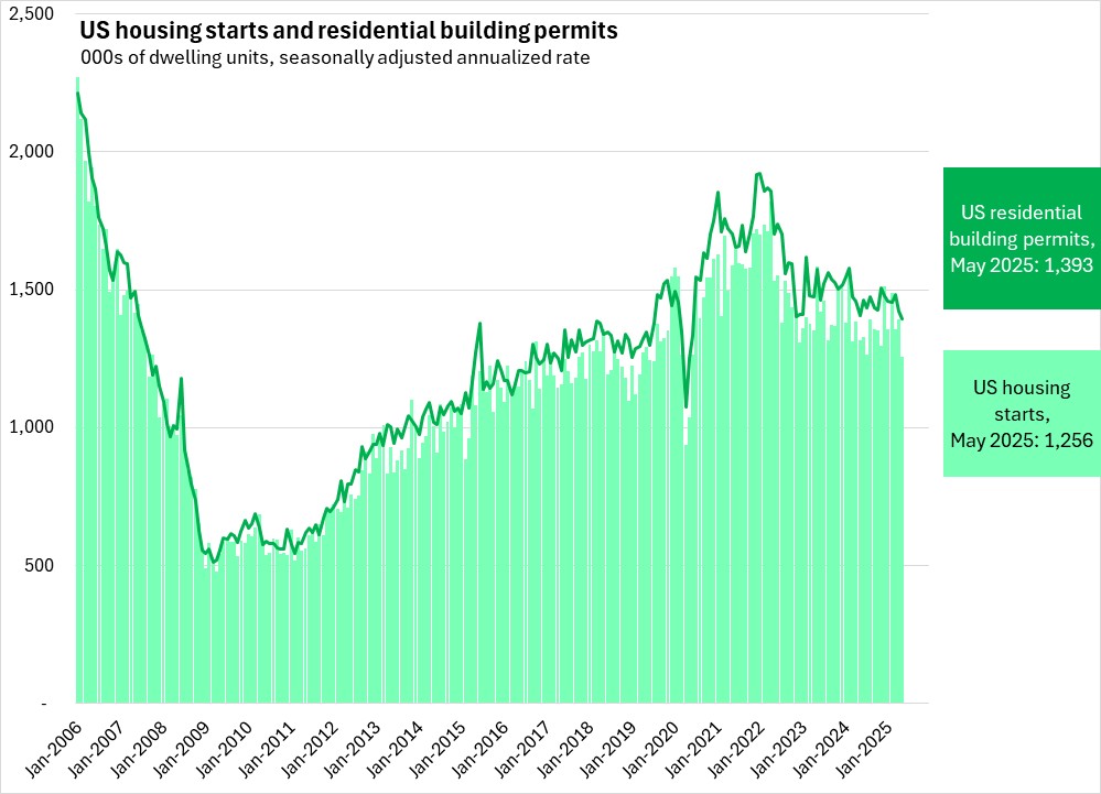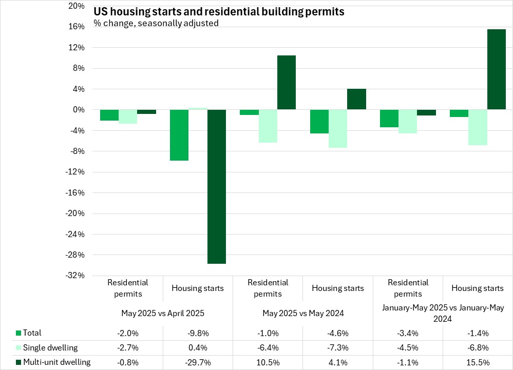 In the first five months of 2025, US housing starts were down 1.4%, with declines in single unit starts (-6.8%) only partially offset by rising multi-unit starts (+15.5%).