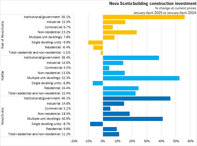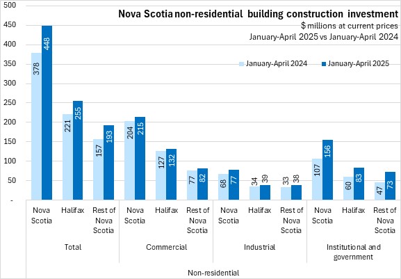 Nova Scotia's total building construction investment increased from $2,014 million in January-April 2024 to $2,240 million in January-April 2025. Non-residential investment was up across the province. There was a decline in residential investment outside of Halifax, resulting in declining overall building investment outside Halifax.