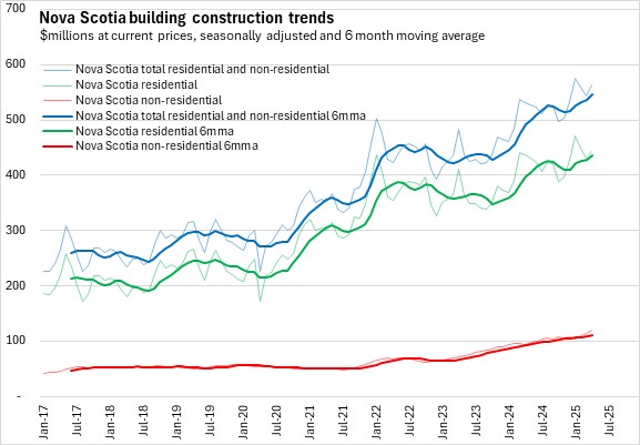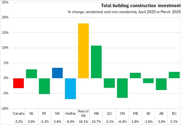 Investment in Nova Scotia building construction rose 3.4% in April 2025 to $562.3 million. Halifax monthly building construction was down 6.9% to $297.8 million while outside of Halifax building construction was up 18.1% to $264.5 million. Nationally, investment in building construction decreased 3.2% with declines in five provinces. Ontario reported the largest decline in building construction investment, while New Brunswick had the fastest increase.