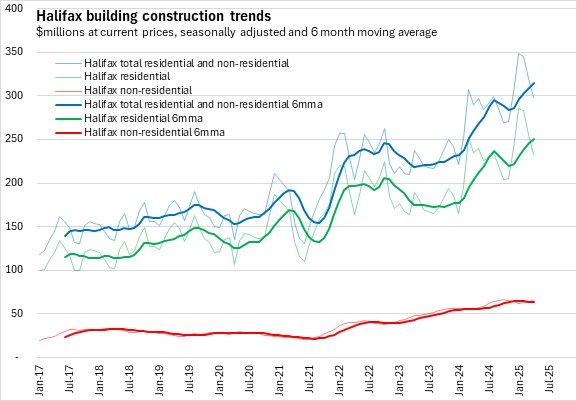 Halifax commercial building construction has plateaued and begun to decline in recent months, while institutional/government and industrial projects continue to grow. Outside the city, non-residential investment levels have begun to increase again after declining on slowing commercial building investments.