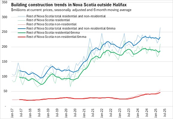 In Halifax, residential construction investment had trended up for multi-unit dwellings since late 2024. However, single unit dwelling investments have peaked and started to trend down again. Outside the city, investment in single dwelling unit construction is typically higher than for multi-unit structures. In Halifax, multiple dwelling unit buildings are a larger share of investment than single dwelling units.