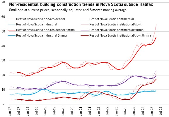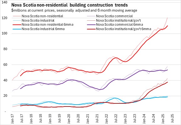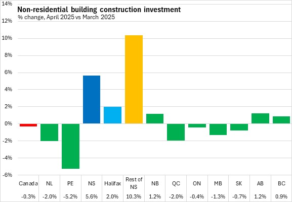 Nova Scotia's non-residential building construction rose 5.6% to $120.3 million, the fastest gain among provinces. In Halifax, non-residential construction was up 2.0% to $65.6 million. Outside of Halifax, non-residential construction was up 10.3% to $54.8 million. National non-residential building construction was down 0.3% in April 2025 with declines in six provinces, led by Prince Edward Island.