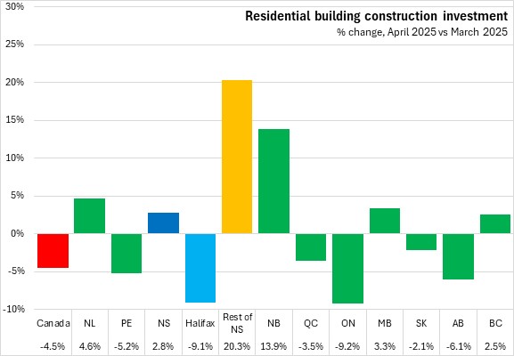 Nova Scotia's April 2025 residential construction investment grew 2.8% to $441.9 million. Halifax residential construction was down 9.1% to $232.2 million. Outside of Halifax residential construction was up 20.3% to $209.7 million. National residential construction decreased by 4.5%, with declines in five provinces. New Brunswick had the largest gain and Ontario reported the fastest decline.
