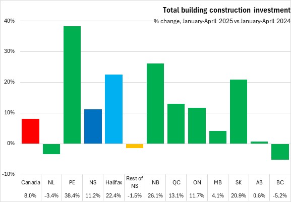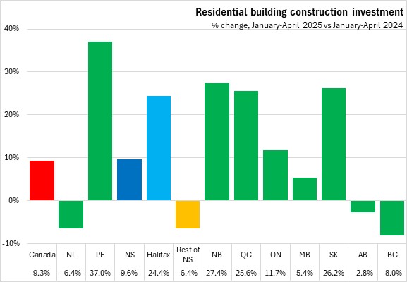 Residential construction investment was up 9.6% in Nova Scotia compared to January-April 2024. Halifax's residential construction was up 24.4% and outside of Halifax residential construction was down 6.4%. National residential construction was up 9.3% with gains in seven provinces. Prince Edwards Island reported the fastest gain, while British Columbia experienced the steepest decline.