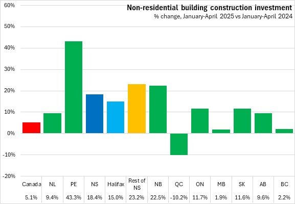 Nova Scotia's non-residential construction was up 18.4% compared to January-April 2024. Halifax's non-residential construction rose 15.0% while outside of Halifax, non-residential construction was up 23.2%. National non-residential construction investment increased 5.1% compared to January-April 2024. All provinces reported gains except Québec. Prince Edward Island reported the fastest gain.