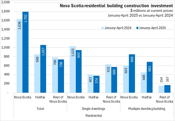 Nova Scotia residential building construction investment growth was driven by an increase in multiple dwelling building construction across the province, offsetting declines in single dwelling building construction across the province.