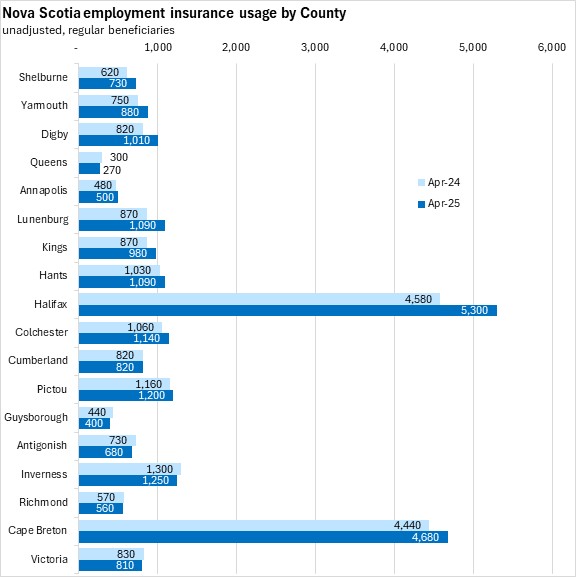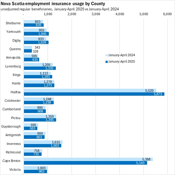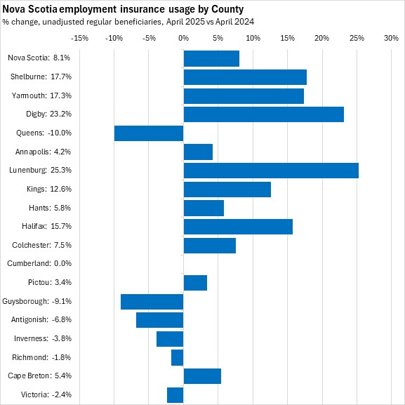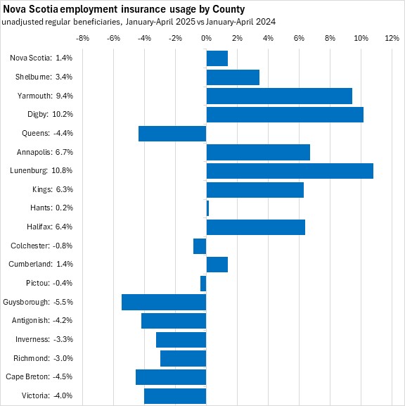 Comparing unadjusted regular beneficiaries for April 2025 against April 2024, employment insurance usage declined the most in Queens, Guysborough, and Antigonish counties (in percentage terms). Employment insurance usage increased the most in Lunenburg, Digby, Shelburne, and Yarmouth counties.