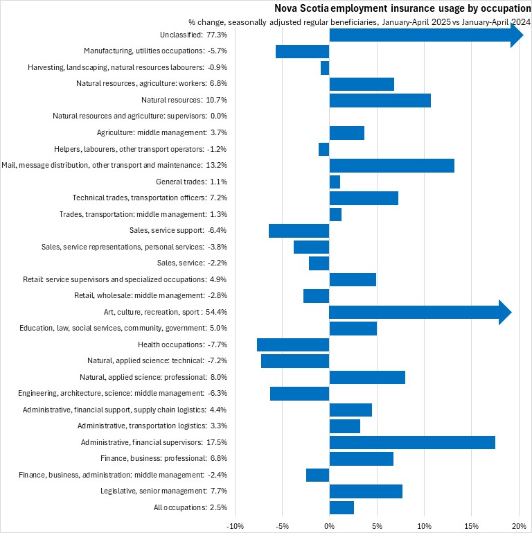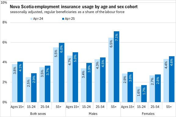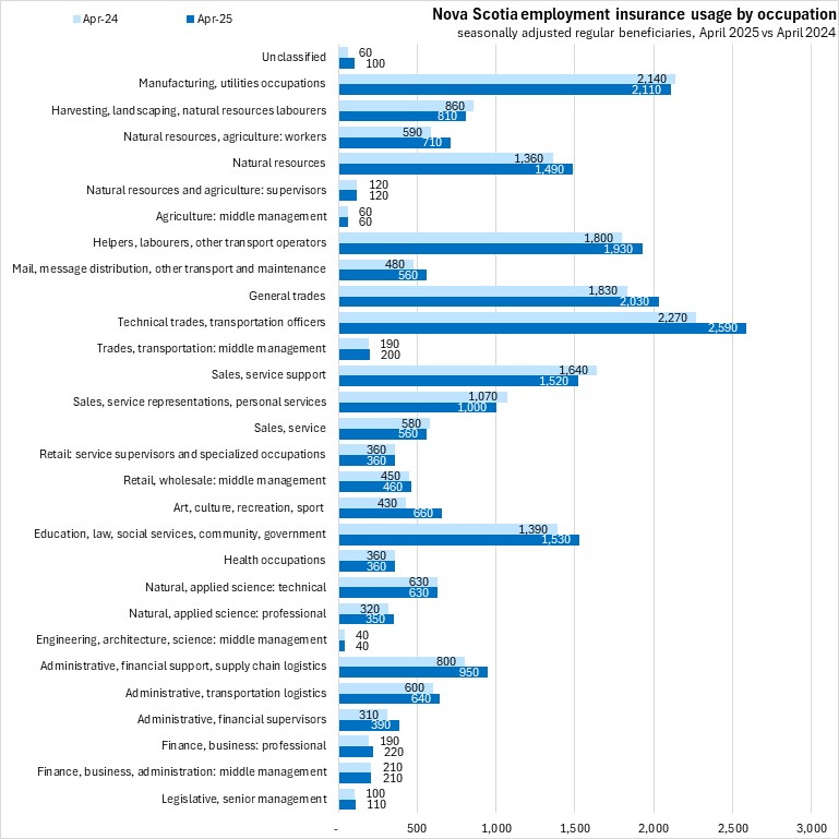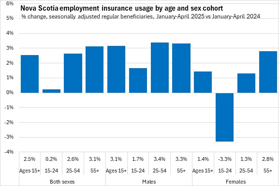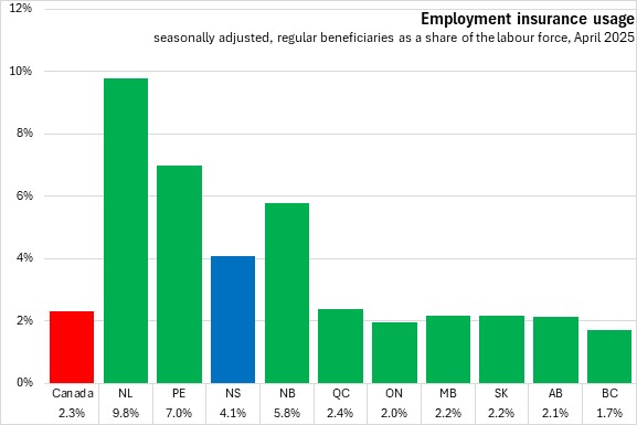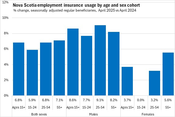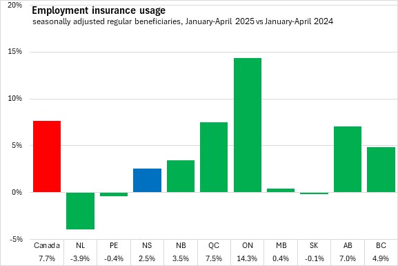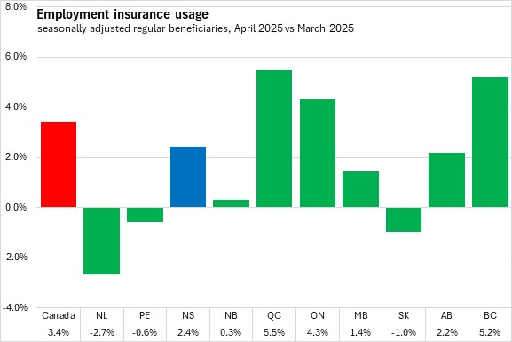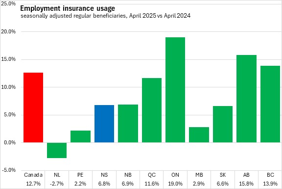 Compared to April 2024, Nova Scotia's employment insurance usage rose 6.8% (+1,450). National employment insurance usage increased 12.7% compared to April 2024. All provinces except Newfoundland and Labrador reported higher employment insurance compared to one year ago, with the fastest rise in Ontario.