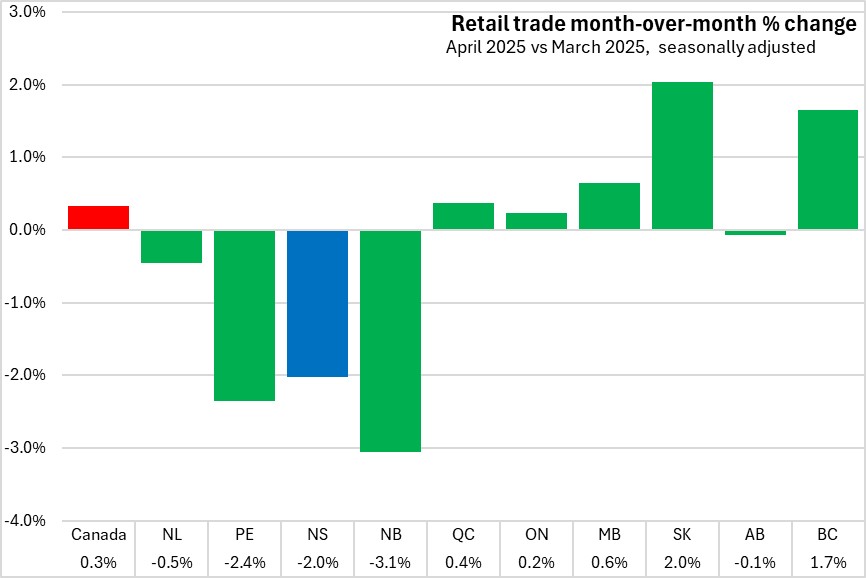 In Nova Scotia retail trade decreased 2.0% to $1,869 million. Nationally, retail trade increased 0.3% to $70.1 billion. Five provinces reported growth in retail trade, led by Saskatchewan. New Brunswick reported the steepest decline.