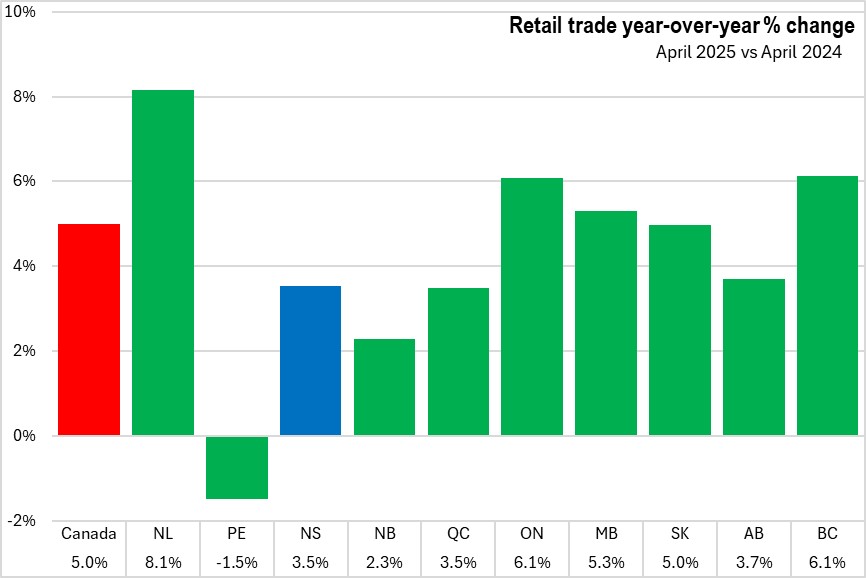 Nova Scotia retail trade increased 3.5% in April compared to the same month last year. Nationally, retail trade was up 5.0% year-over-year. Nine provinces reported year-over-year increases in retail trade, led by Newfoundland and Labrador. Only Prince Edward Island reported a decline.