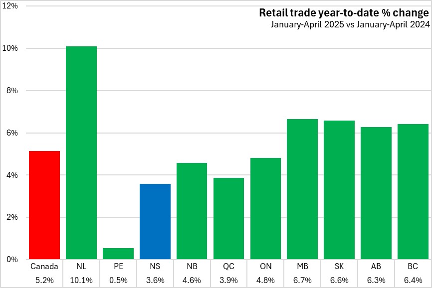 Nova Scotia retail trade increased 3.6% in January-April compared to the same period last year. Nationally, retail trade was up 5.2% year-to-date. All provinces reported year-to-date increases in retail trade, led by Newfoundland and Labrador. Prince Edward Island reported the slowest growth.