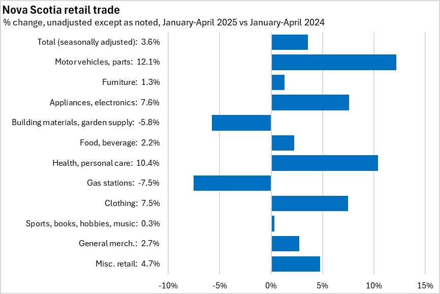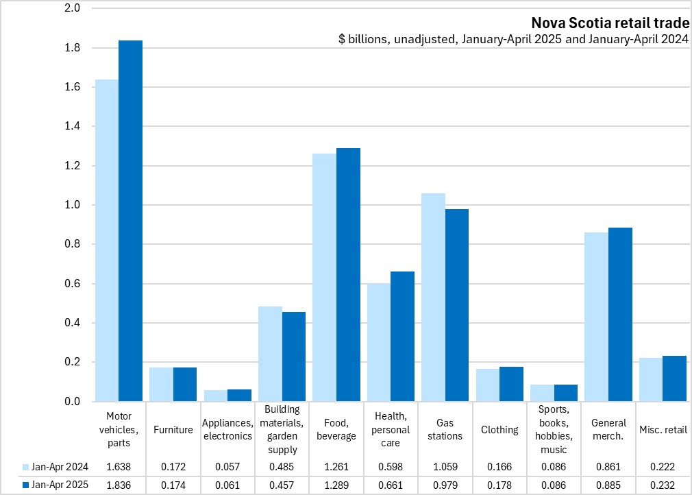 In dollar terms, motor vehicles/parts ($1.836 billion), food/beverage ($1.289 million), gas stations ($979 million) and general merchandise stores ($885 million) contributed the most to Nova Scotia's retail sales in January-April 2025.