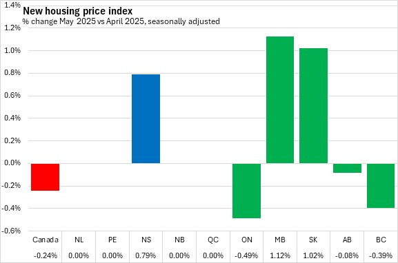 Nova Scotia new housing prices grew 0.79% from April to May 2025. Nationally the price of new houses declined 0.24%, with three provinces reporting declines. Ontario posted the largest decline and Manitoba posted the largest gain, with four provinces reporting no change month-over-month.