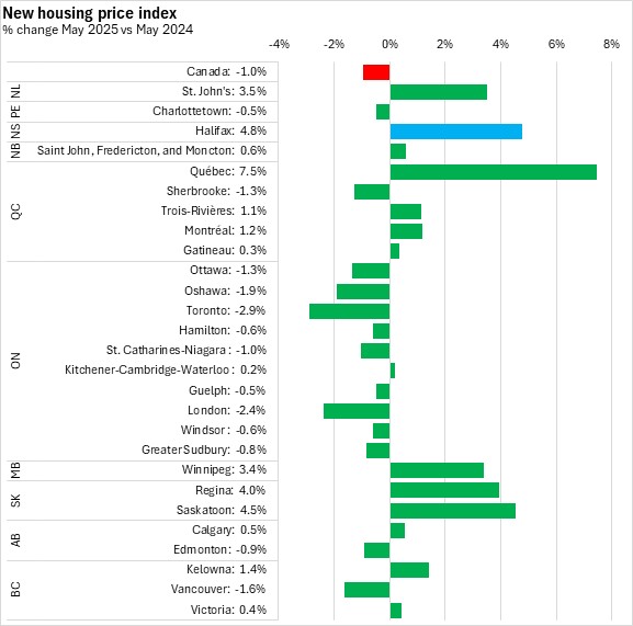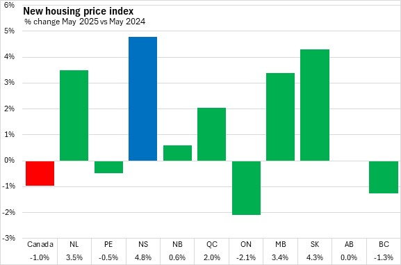 Nova Scotia’s new housing prices increased 4.8% from May 2024 to May 2025. Nationally, prices were down 1.0%.