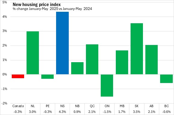 In the first five months of 2025, Nova Scotia's new housing price index was 4.3% higher compared to the same period in 2024, the largest increase among provinces. Nationally, new housing prices were down 0.3% year-to-date with gains in seven provinces. Year-to-date declines in new housing prices were lead by Ontario.