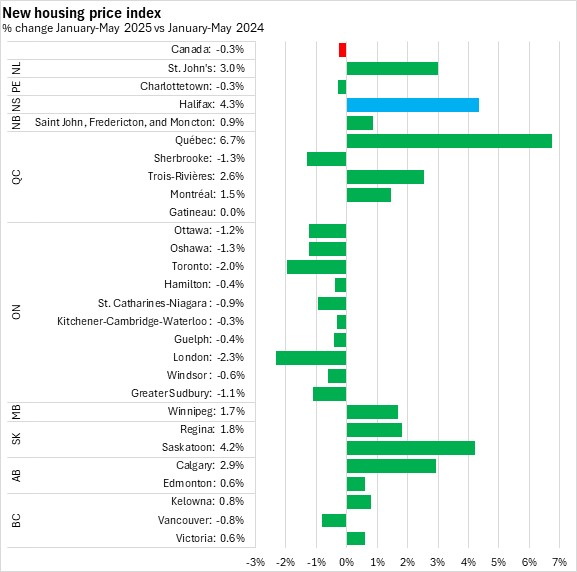 Halifax new housing prices were up 4.3% in January-May 2025 compared to January-May 2024. The fastest growth among CMAs was in Québec City and the fastest decline was in London.