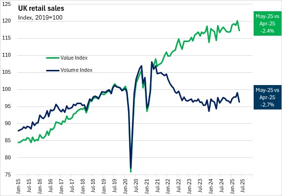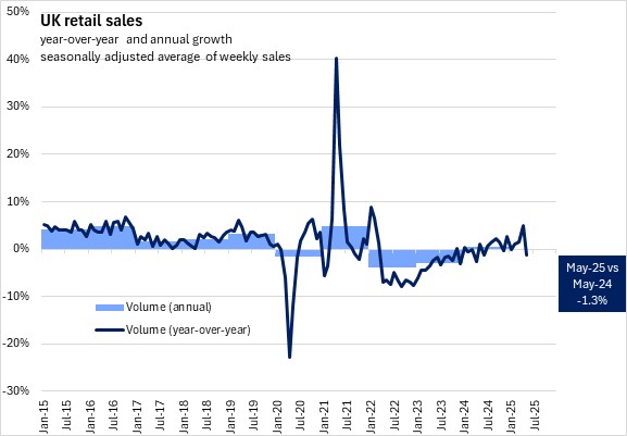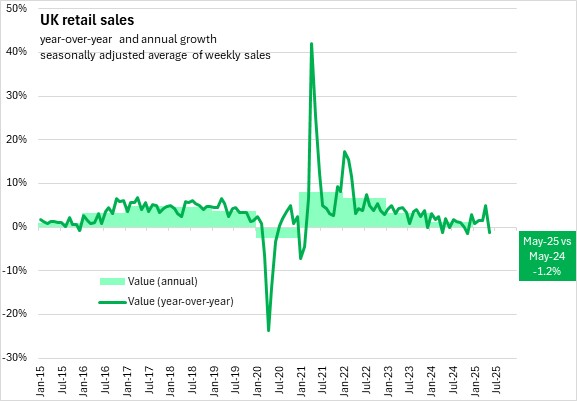 June 20, 2025UK RETAIL SALES, MAY 2025 Month-over-month (May 2025 vs April 2025, seasonally adjusted)