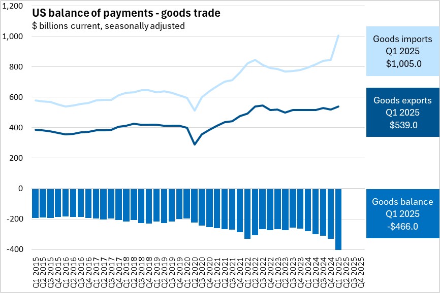 In Q1 2025, US goods exports increased by $21.1 billion to $539.0 billion, while US goods imports increased by $158.2 billion to $1.0 trillion.